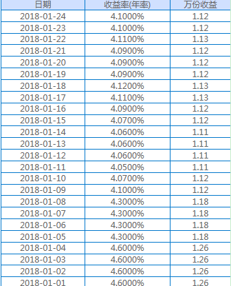 現(xiàn)金寶(1號)人民幣理財計劃參考收益率(2018年1月) 日期:2018-01-25 14:36:05 收益率:興業(yè)銀行現(xiàn)金寶(1號)人民幣理財計劃產(chǎn)品當(dāng)天為理財客戶實(shí)現(xiàn)的年化收益率(客戶凈收益率,已扣除銀行管理費(fèi)率)。 萬份收益:每1萬元興業(yè)銀行現(xiàn)金寶(1號)人民幣理財計劃產(chǎn)品當(dāng)天的收益金額。 上一篇 返回 下一篇