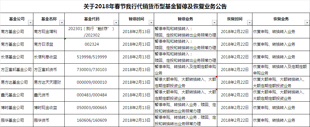 1、2018年2月13日至2月21日,根據(jù)各基金公司通知,為保護(hù)基金份額持有人權(quán)益部分貨幣型基金業(yè)務(wù)將暫停,2018年2月22日,各項(xiàng)業(yè)務(wù)將恢復(fù)正常,屆時(shí)不再公告,最終以基金公司發(fā)布公告為準(zhǔn)。