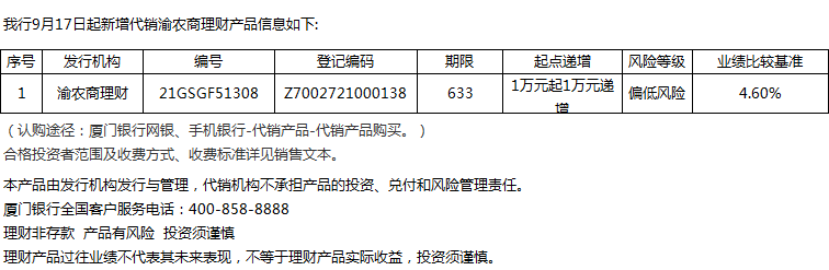 廈門銀行9月17日代銷渝農(nóng)商理財(cái)產(chǎn)品信息