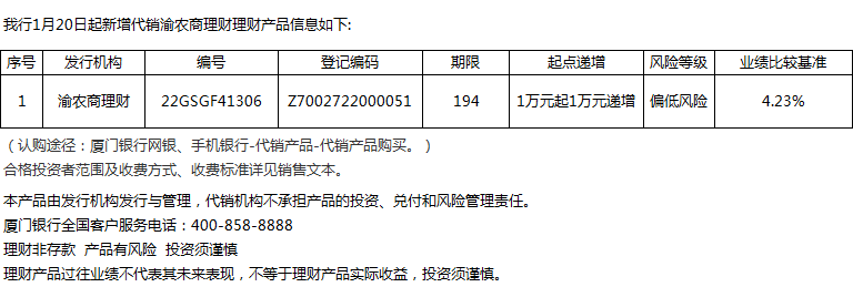 廈門銀行1月20日代銷渝農(nóng)商理財理財產(chǎn)品信息