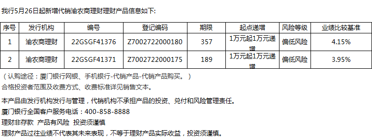 廈門銀行5月26日代銷渝農(nóng)商理財(cái)理財(cái)產(chǎn)品信息