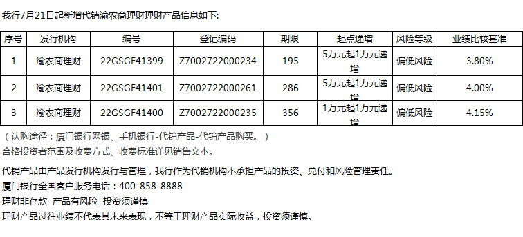 廈門(mén)銀行7月21日代銷(xiāo)渝農(nóng)商理財(cái)理財(cái)產(chǎn)品信息