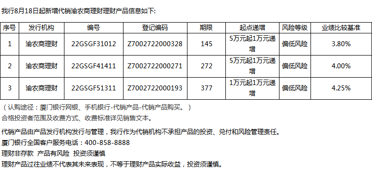 廈門銀行8月18日代銷渝農(nóng)商理財理財產(chǎn)品信息