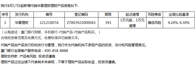 廈門銀行8月17日代銷華夏理財(cái)理財(cái)產(chǎn)品信息