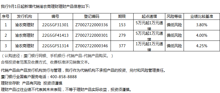 廈門銀行9月1日代銷渝農(nóng)商理財理財產(chǎn)品信息
