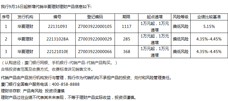 廈門銀行9月16日代銷華夏理財(cái)理財(cái)產(chǎn)品信息