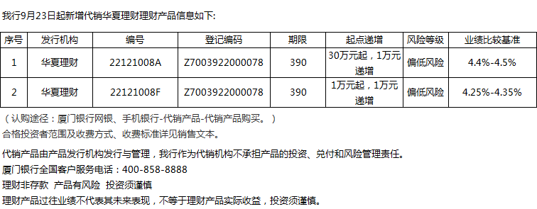 廈門銀行9月23日代銷華夏理財理財產(chǎn)品信息