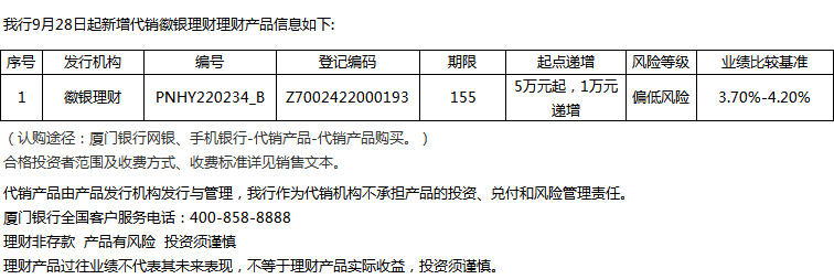 廈門銀行9月28日代銷徽銀理財(cái)理財(cái)產(chǎn)品信息