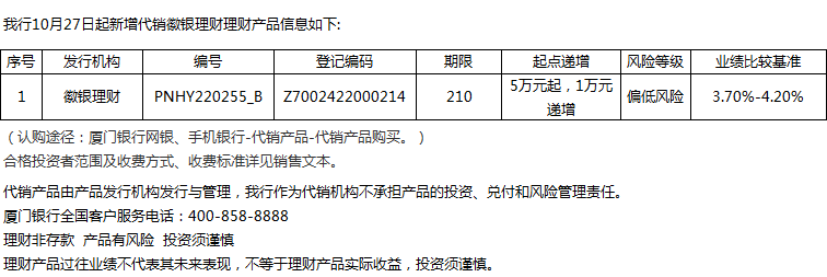 廈門銀行10月27日代銷徽銀理財理財產(chǎn)品信息