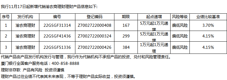 廈門銀行11月17日代銷渝農(nóng)商理財理財產(chǎn)品信息