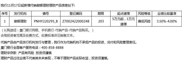 廈門銀行11月17日代銷徽銀理財理財產(chǎn)品信息