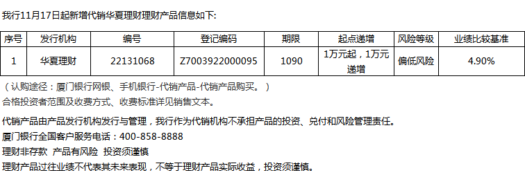 廈門銀行11月17日代銷華夏理財理財產(chǎn)品信息