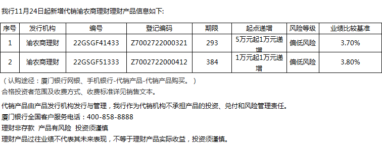 廈門銀行11月24日代銷渝農商理財理財產品信息