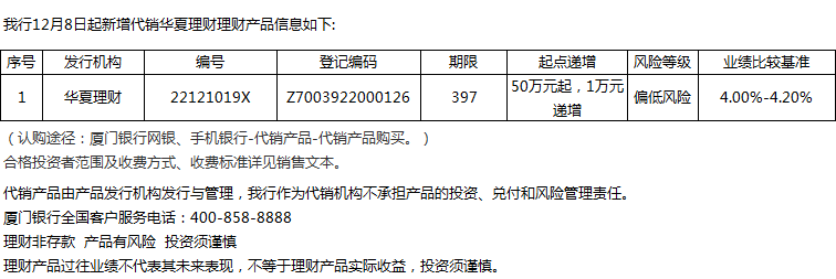 廈門銀行12月8日代銷華夏理財(cái)理財(cái)產(chǎn)品信息