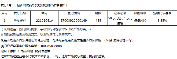 廈門銀行1月5日代銷華夏理財理財產品信息