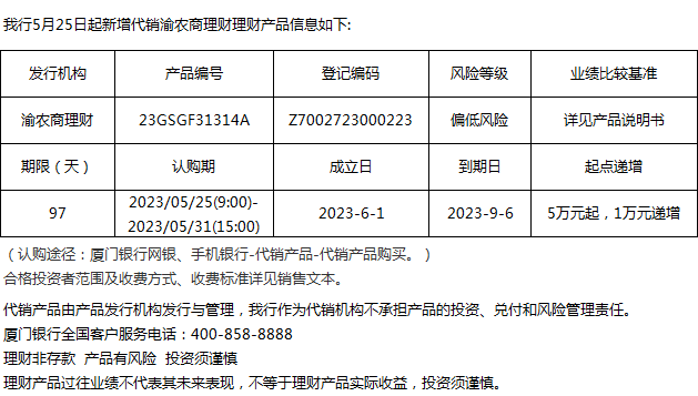 廈門銀行5月25日代銷渝農(nóng)商理財理財產(chǎn)品信息