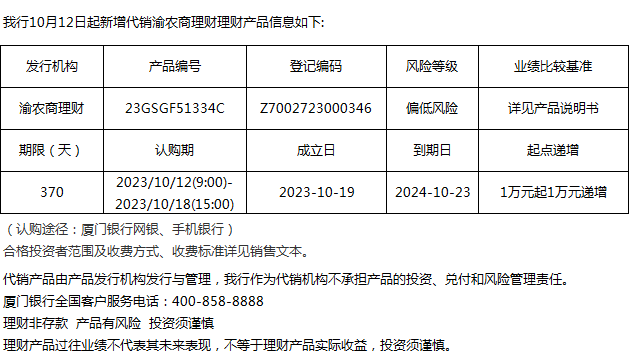 廈門銀行10月12日代銷渝農(nóng)商理財理財產(chǎn)品信息