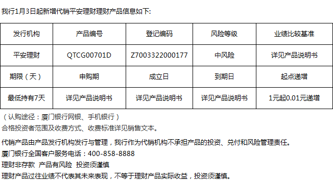 廈門(mén)銀行1月3日代銷(xiāo)平安理財(cái)理財(cái)產(chǎn)品信息