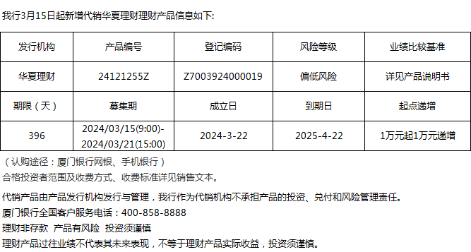 廈門銀行3月15日代銷華夏理財理財產(chǎn)品信息
