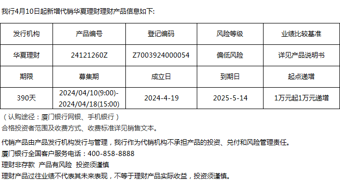廈門銀行4月10日代銷華夏理財(cái)理財(cái)產(chǎn)品信息