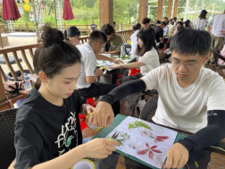 雙人手工DIY拓印活動(dòng)中,學(xué)員們收集了梅花山上散落的樹葉、花朵等,將汁液拓在帆布袋上,充分發(fā)揮想象力和創(chuàng)造力,創(chuàng)作出只屬于兩人的手工作品,增強(qiáng)了彼此間的合作默契,更加深了對(duì)彼此的了解。