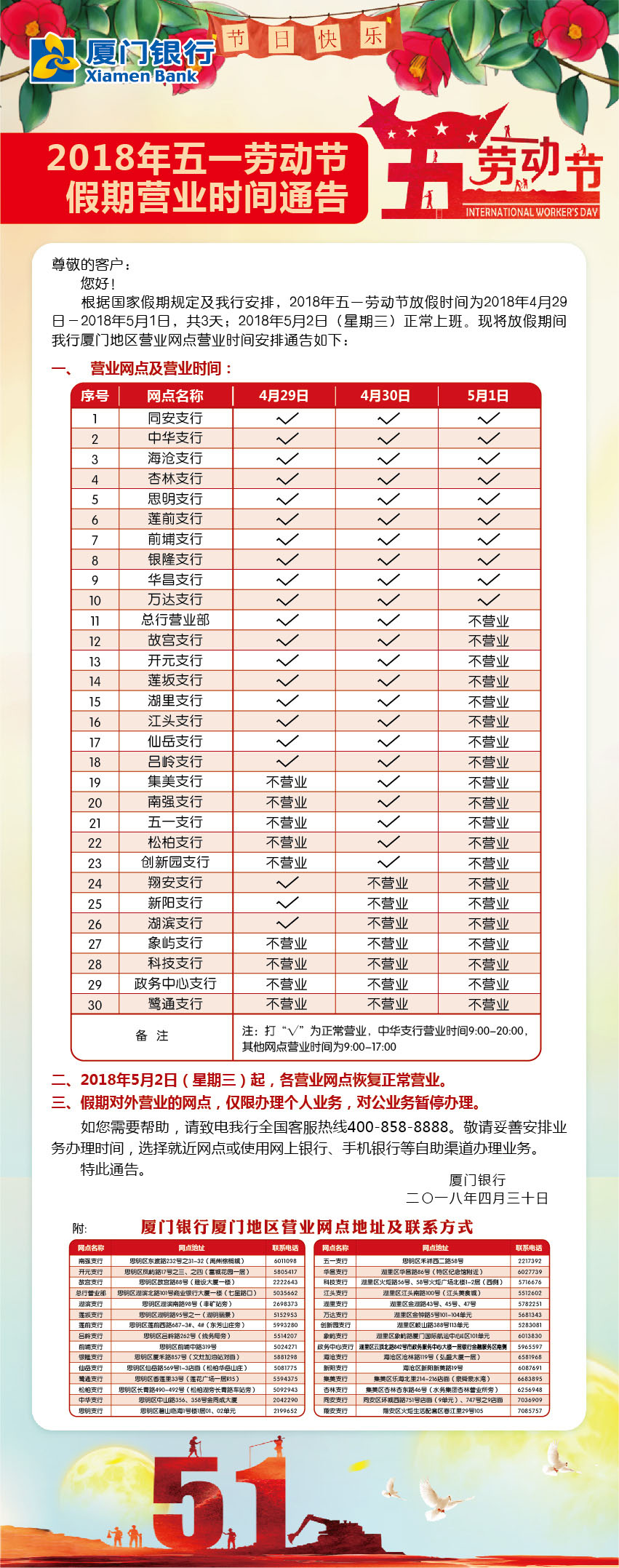 2018年五一勞動節(jié)假期營業(yè)時間的通告
