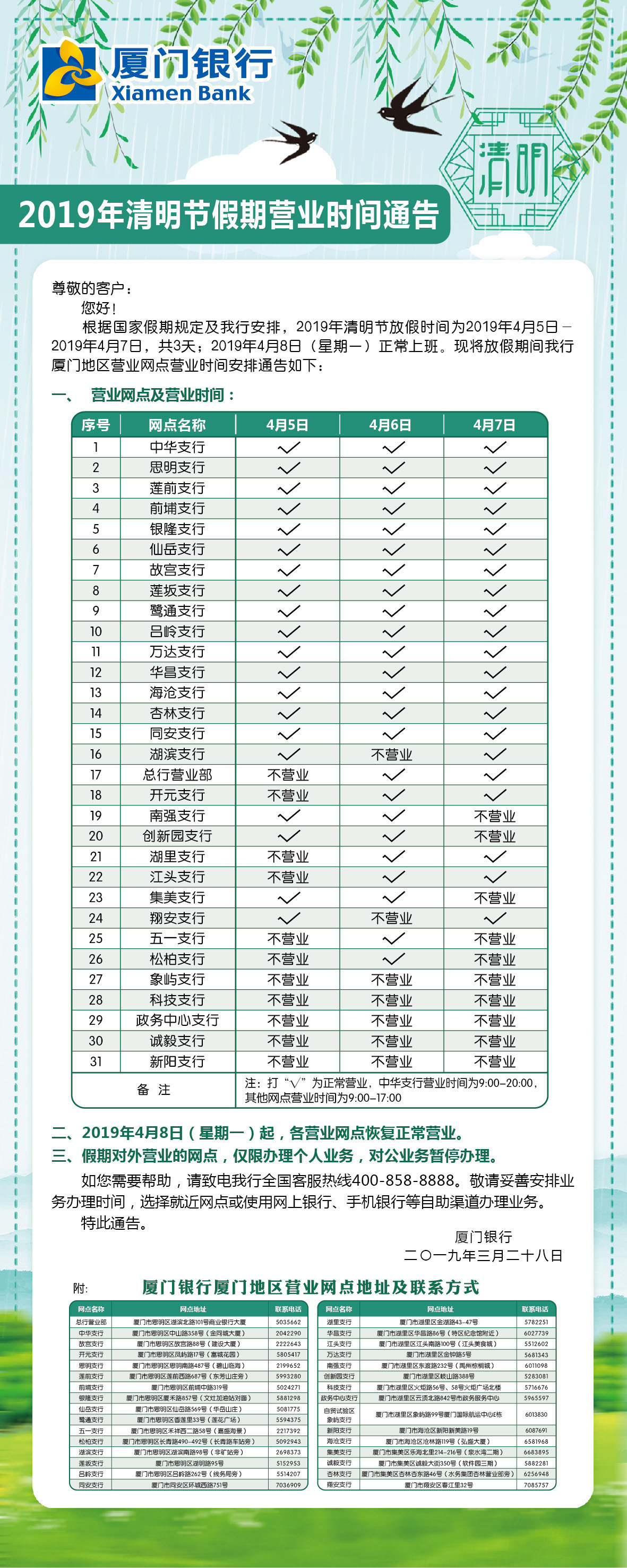 2019年廈門銀行廈門地區(qū)清明假期各網(wǎng)點(diǎn)營(yíng)業(yè)時(shí)間
