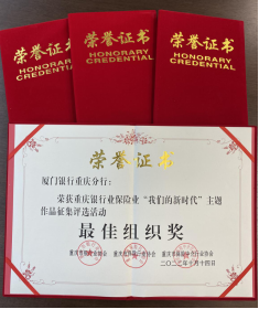 9-10月期間,廈門銀行重慶分行積極組織參與了重慶銀行業(yè)保險(xiǎn)業(yè)“我們的新時(shí)代”主題作品征集評(píng)選活動(dòng),并在本次活動(dòng)中榮獲集體“最佳組織獎(jiǎng)”以及三個(gè)單項(xiàng)獎(jiǎng)。
