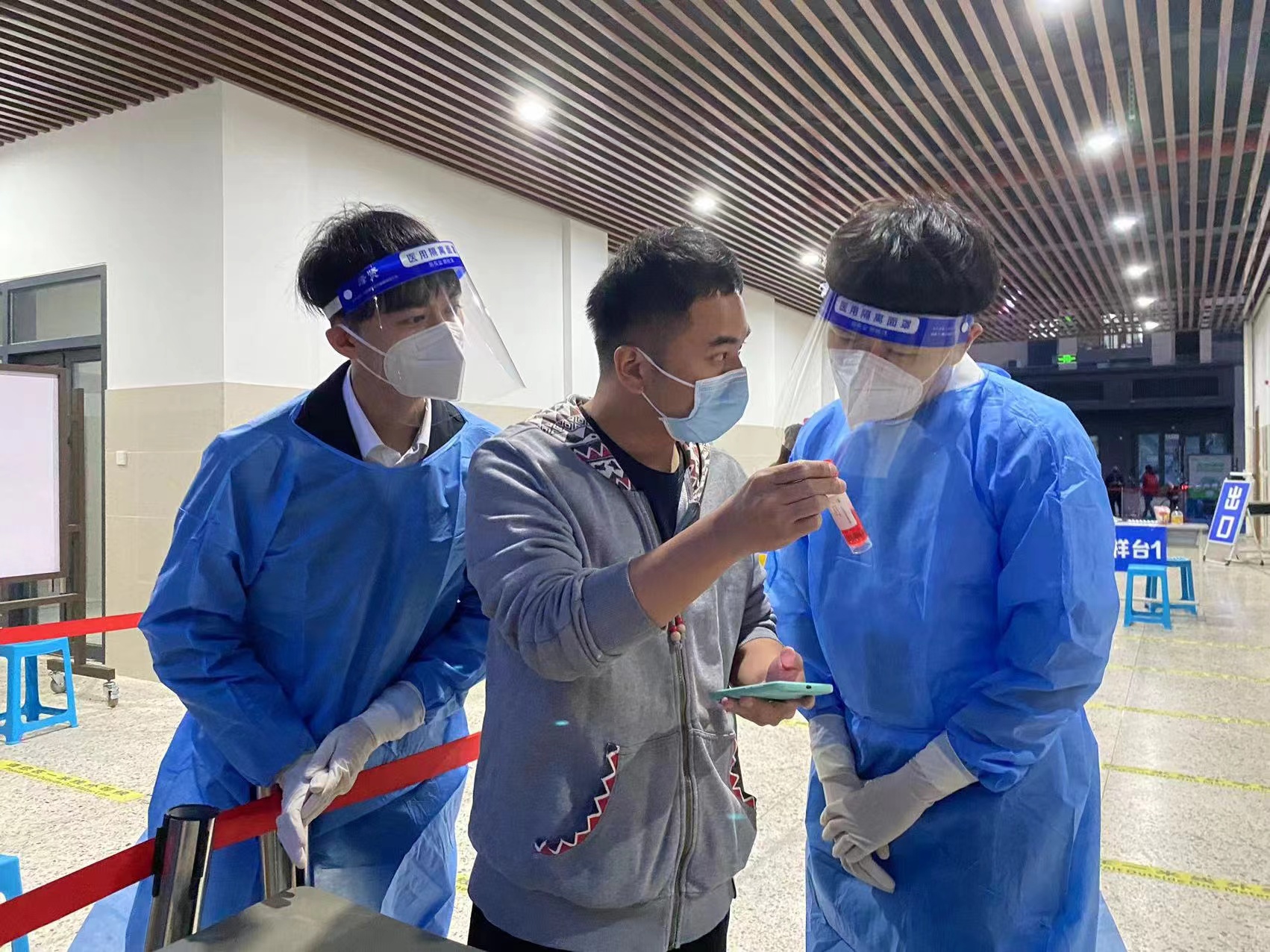 為確保檢測有序進(jìn)行,志愿者們?cè)诓煌瑣徫桓魉酒渎?,引?dǎo)現(xiàn)場群眾排隊(duì)、協(xié)助信息采集、為醫(yī)護(hù)人員提供后勤保障。“請(qǐng)先掃碼”“請(qǐng)這邊排隊(duì)”……簡單的語言和動(dòng)作重復(fù)了上百次,有的志愿者喉嚨已沙啞,但他們?nèi)员M忠職守,堅(jiān)守一線,用實(shí)際行動(dòng)筑起堅(jiān)實(shí)防線。