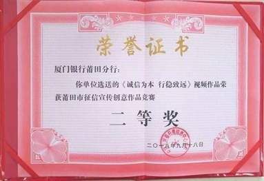 廈門銀行莆田分行喜獲莆田市征信宣傳創(chuàng)意作品競(jìng)賽二等獎(jiǎng)