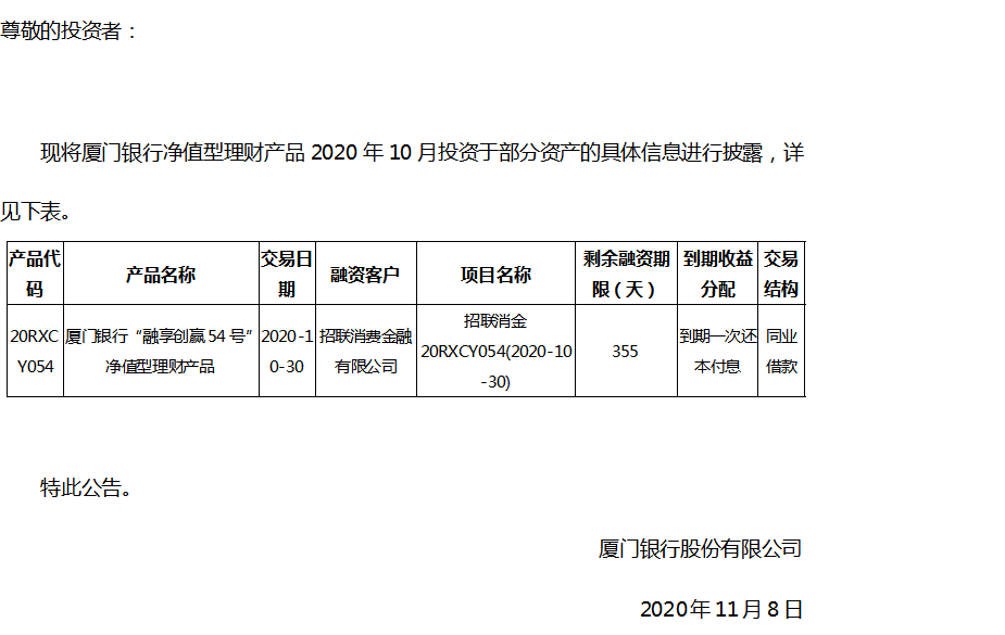 關(guān)于廈門銀行凈值型理財(cái)產(chǎn)品2020年10月投資部分資產(chǎn)的公告