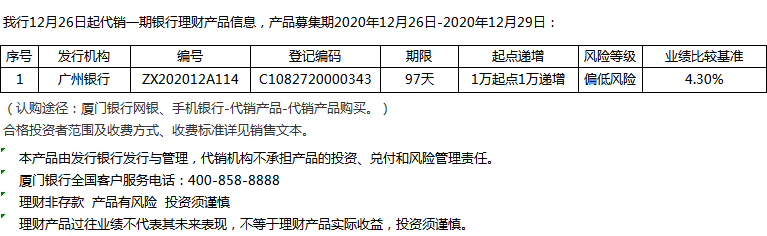 廈門銀行12月26日代銷銀行理財產(chǎn)品信息