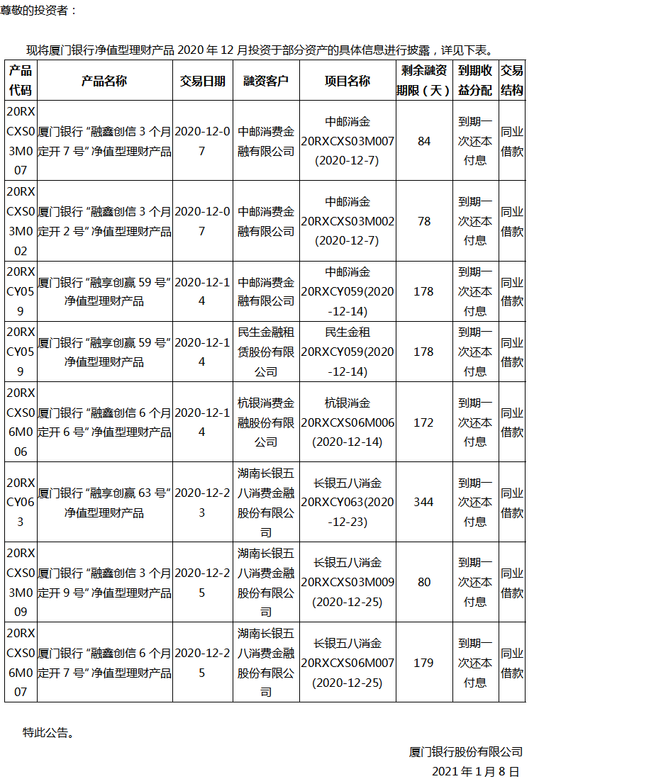 關于廈門銀行凈值型理財產品2020年12月投資部分資產的公告