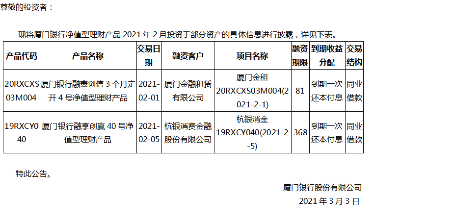 關(guān)于廈門銀行凈值型理財產(chǎn)品2021年2月投資部分資產(chǎn)的公告