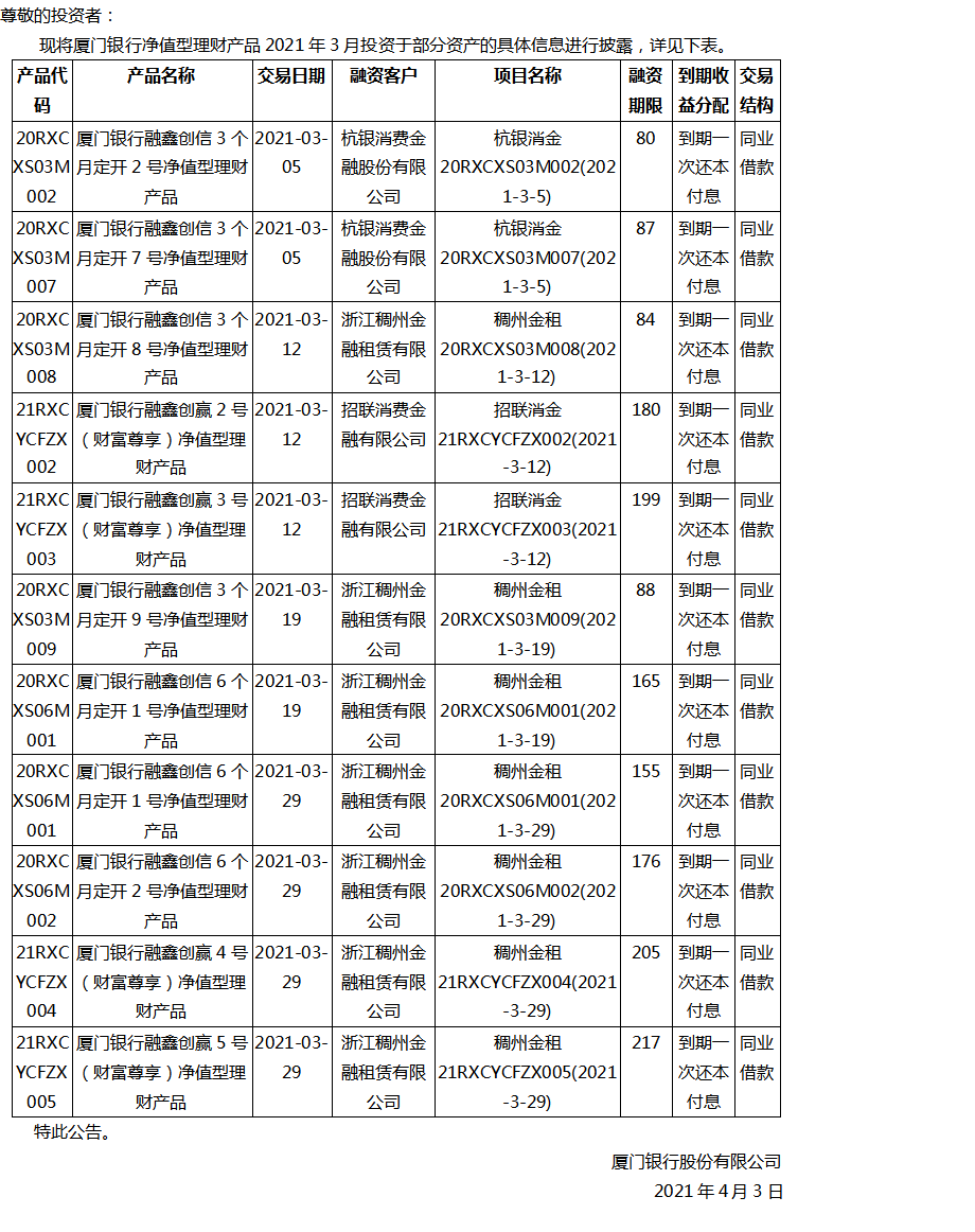 關(guān)于廈門銀行凈值型理財(cái)產(chǎn)品2021年3月投資部分資產(chǎn)的公告