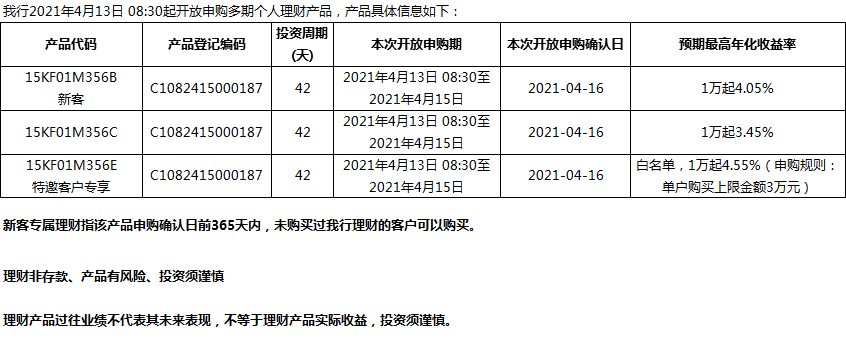 “鳳凰花”理財產(chǎn)品2021年4月13日發(fā)售信息