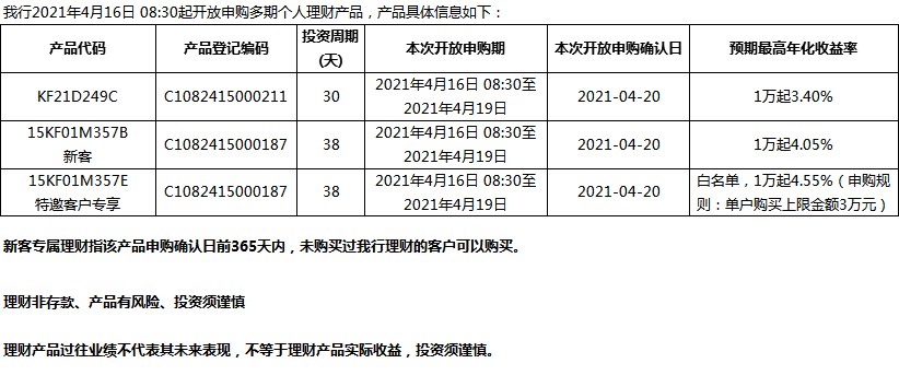“鳳凰花”理財產(chǎn)品2021年4月16日發(fā)售信息