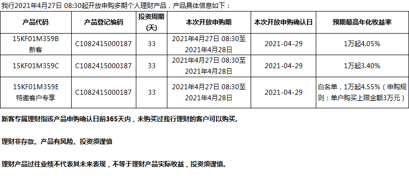 “鳳凰花”理財產(chǎn)品2021年4月27日發(fā)售信息