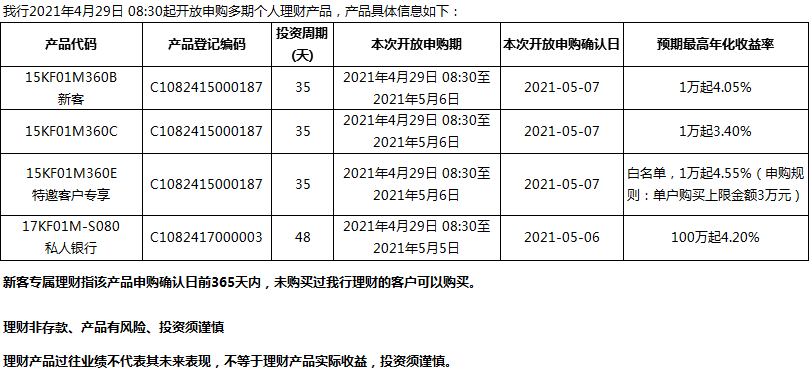 “鳳凰花”理財(cái)產(chǎn)品2021年4月29日發(fā)售信息