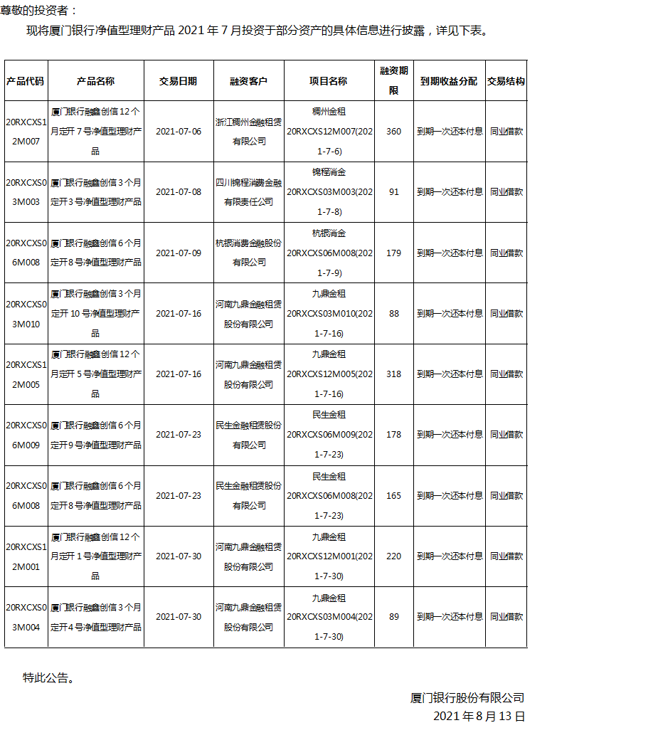 關(guān)于廈門(mén)銀行凈值型理財(cái)產(chǎn)品2021年7月投資部分資產(chǎn)的公告