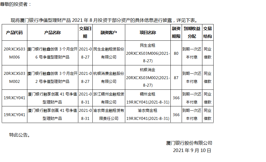 關于廈門銀行凈值型理財產品2021年8月投資部分資產的公告