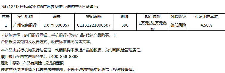廈門銀行12月3日代銷廣州農(nóng)商銀行理財產(chǎn)品信息