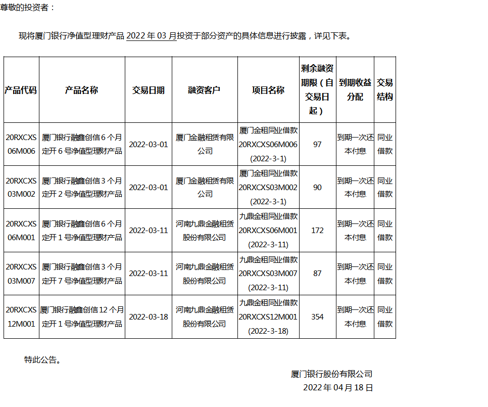 關(guān)于廈門銀行凈值型理財(cái)產(chǎn)品2022年03月投資部分資產(chǎn)的公告