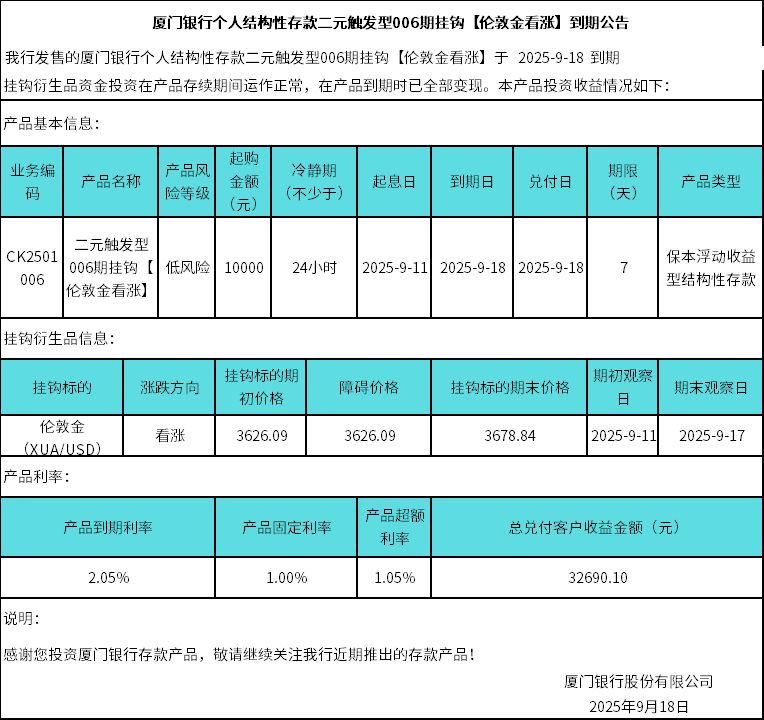 廈門銀行個(gè)人結(jié)構(gòu)性存款二元觸發(fā)型006期掛鉤【倫敦金看漲】到期公告