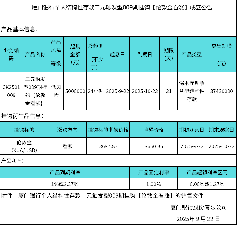 廈門(mén)銀行個(gè)人結(jié)構(gòu)性存款二元觸發(fā)型009期掛鉤【倫敦金看漲】成立公告 日期:2025-09-22 16:40:50 廈門(mén)銀行個(gè)人結(jié)構(gòu)性存款二元觸發(fā)型009期掛鉤【倫敦金看漲】銷(xiāo)售文件.zip 返回 下一篇