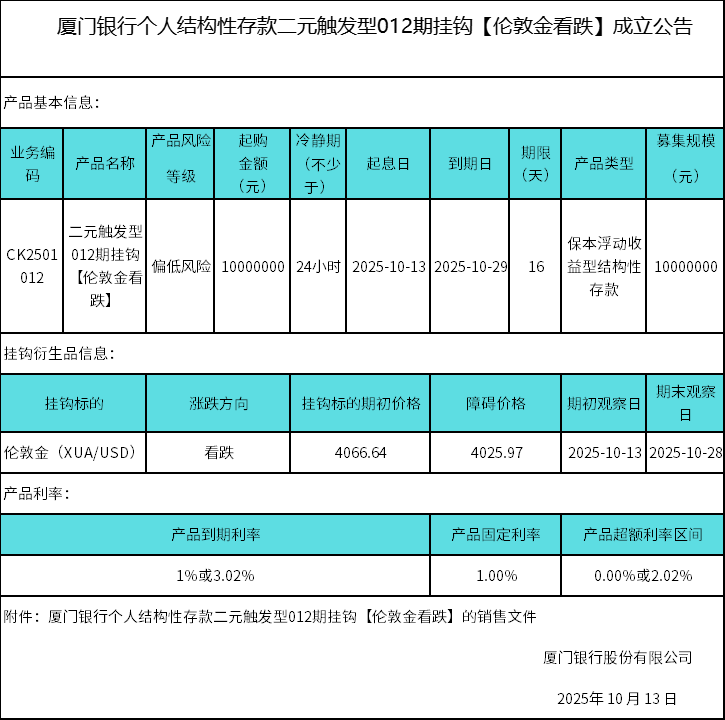 廈門銀行個(gè)人結(jié)構(gòu)性存款二元觸發(fā)型012期掛鉤【倫敦金看跌】成立公告 日期:2025-10-13 15:35:18 廈門銀行個(gè)人結(jié)構(gòu)性存款二元觸發(fā)型012期掛鉤【倫敦金看跌】銷售文件.zip 返回 下一篇