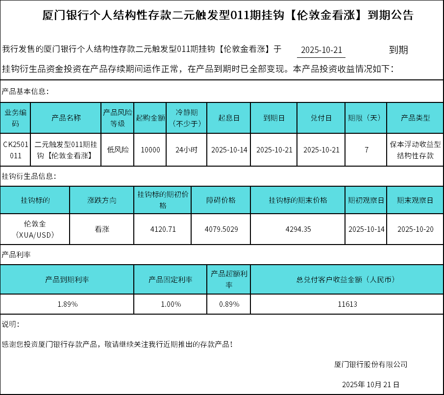 廈門(mén)銀行個(gè)人結(jié)構(gòu)性存款二元觸發(fā)型011期掛鉤【倫敦金看漲】到期公告