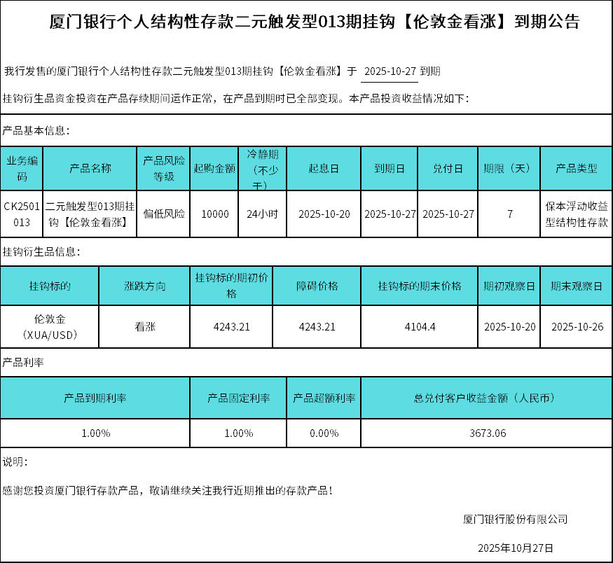 廈門銀行個(gè)人結(jié)構(gòu)性存款二元觸發(fā)型013期掛鉤【倫敦金看漲】到期公告