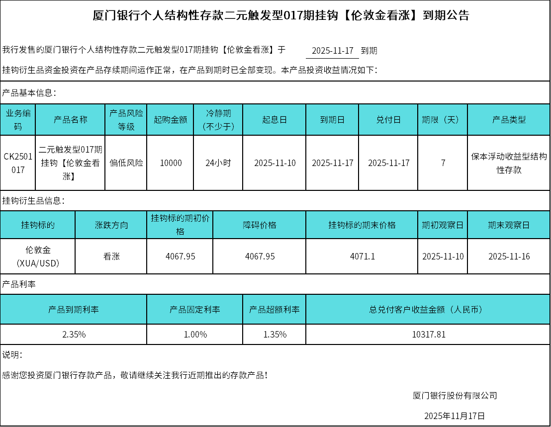 廈門銀行個(gè)人結(jié)構(gòu)性存款二元觸發(fā)型017期掛鉤【倫敦金看漲】到期公告