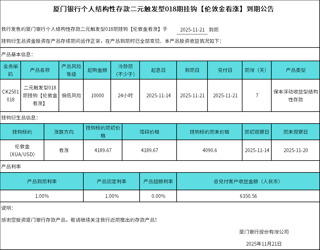 廈門銀行個人結構性存款二元觸發(fā)型018期掛鉤【倫敦金看漲】到期公告
